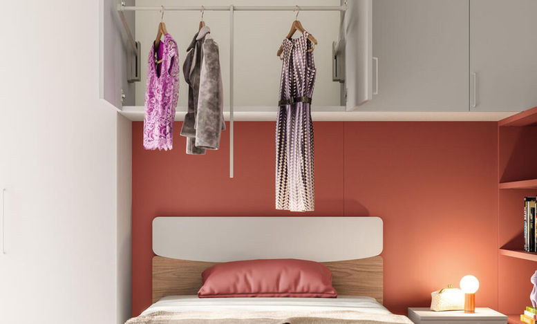 L’armadio a ponte si integra con discrezione nello spazio, mentre lo scrittoio, più protagonista, impreziosisce l’ambiente insieme al suo pouf rigorosamente tone on tone, per un equilibrio perfetto tra funzionalità ed eleganza.