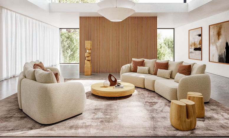 È un vero sistema modulare pensato per offrire massima libertà progettuale: elementi centrali e laterali di diverse larghezze, angoli, sezioni a 45°, pouf coordinati e chaise longue arrotondate permettono di creare composizioni lineari, curvilinee o con tagli più geometrici, adattandosi con facilità a qualsiasi spazio.